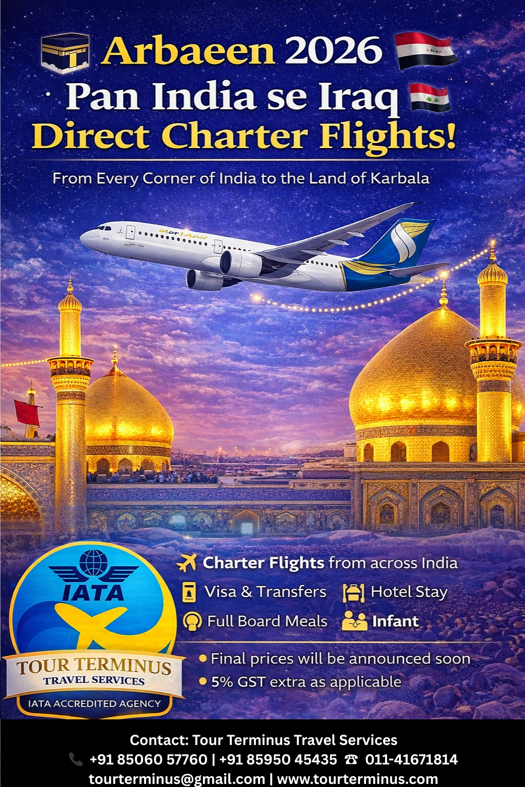 Arbaeen 2026 ke liye, Tour Terminus Travel Services (IATA Accredited Agent) lekar aa raha hai Special Charter Flight Services — taaki aapka safar zyada comfortable, organised aur sukoon bhara ho.