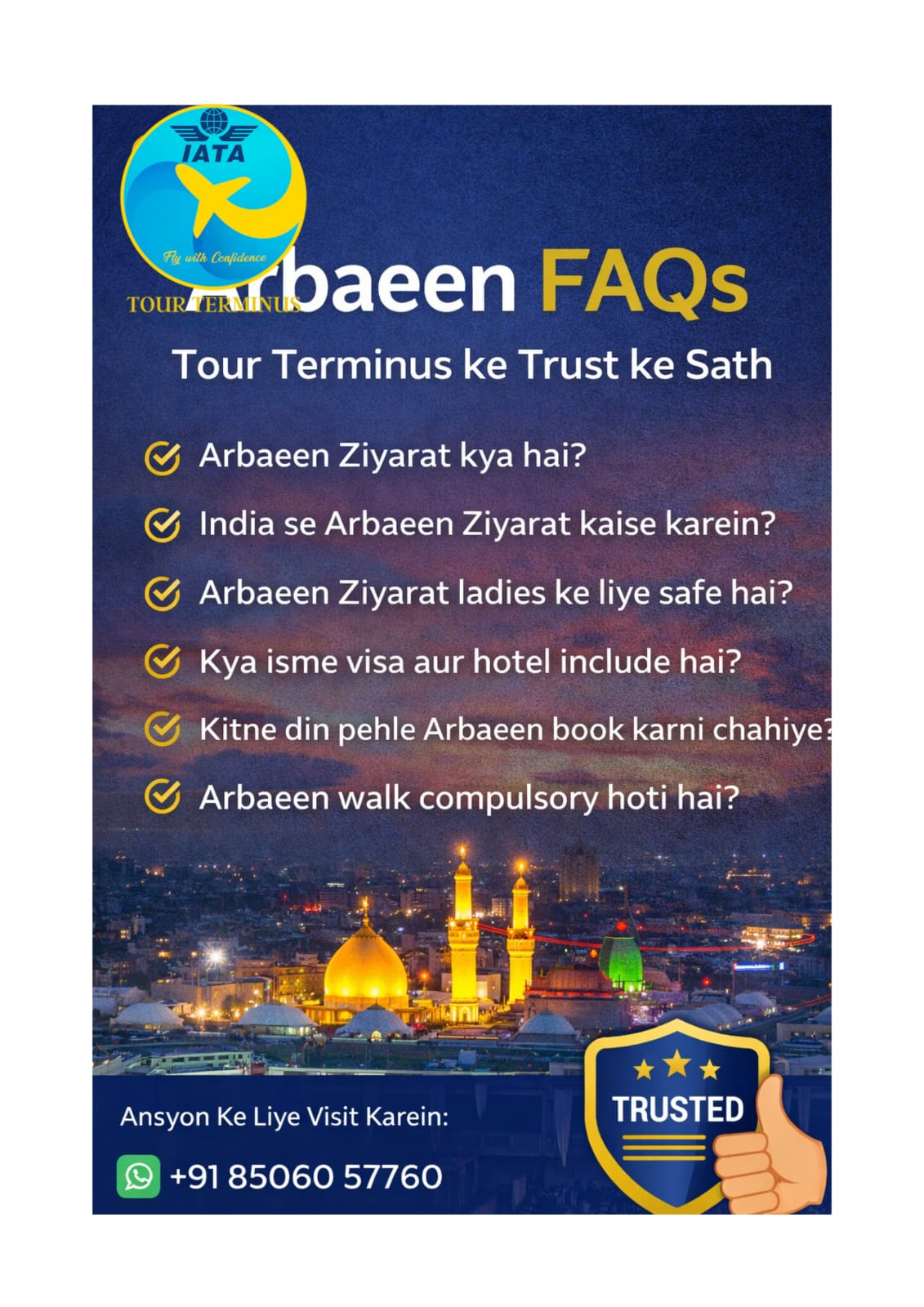 Arbaeen Ziyarat India se registered travel agencies ke through book ki jati hai. Tour Terminus jaise agencies Pan India se departures, visa assistance, flights, accommodation aur complete coordination provide karti hain.